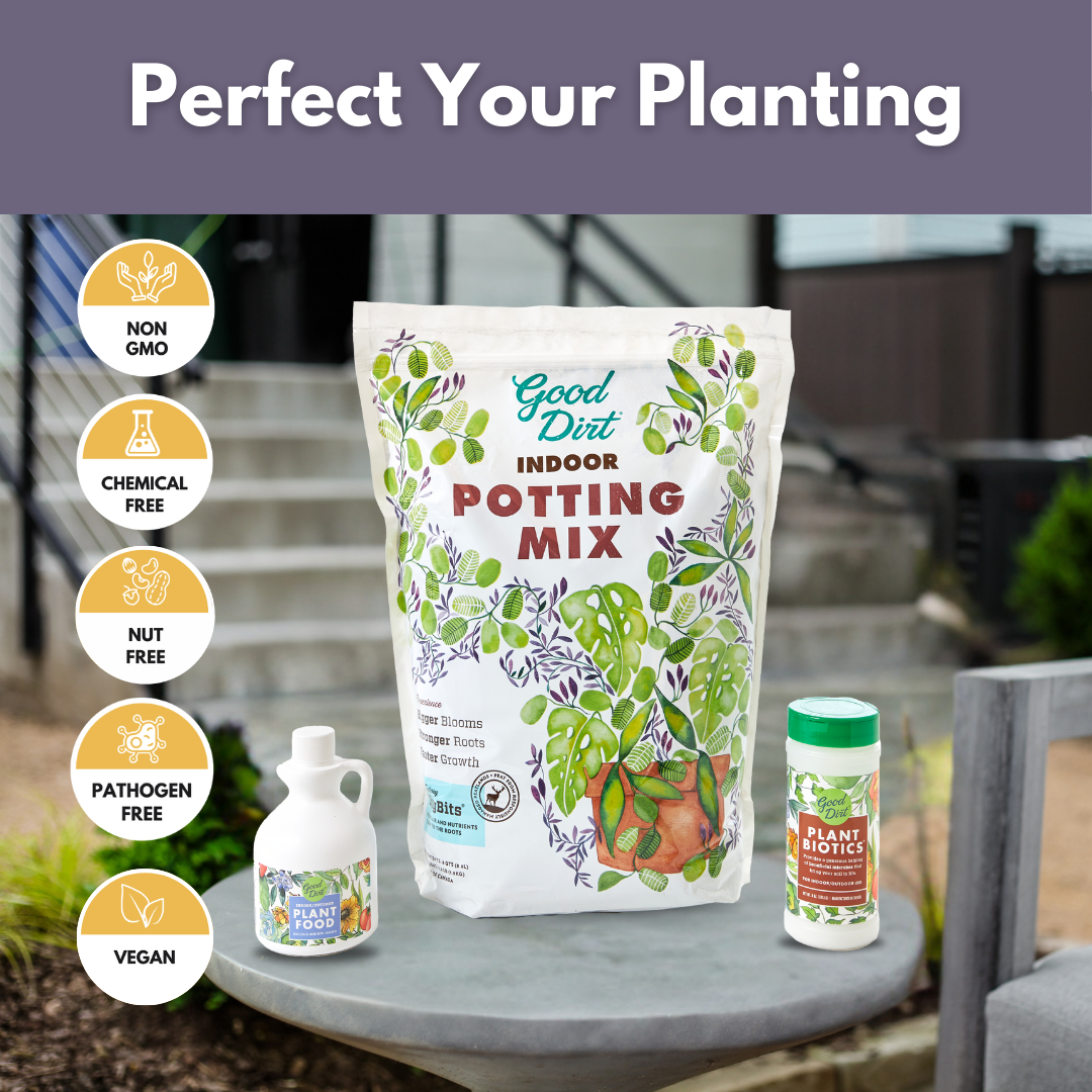Plants aren't accustomed to living indoors in a pot. Good Dirt's three-part Starter Kit is a system that establishes a LIVING SOIL. This bio-active ecosystem (similar to what plants experience in the wild) produces rapid roots, brighter blooms, and lusher leaves.